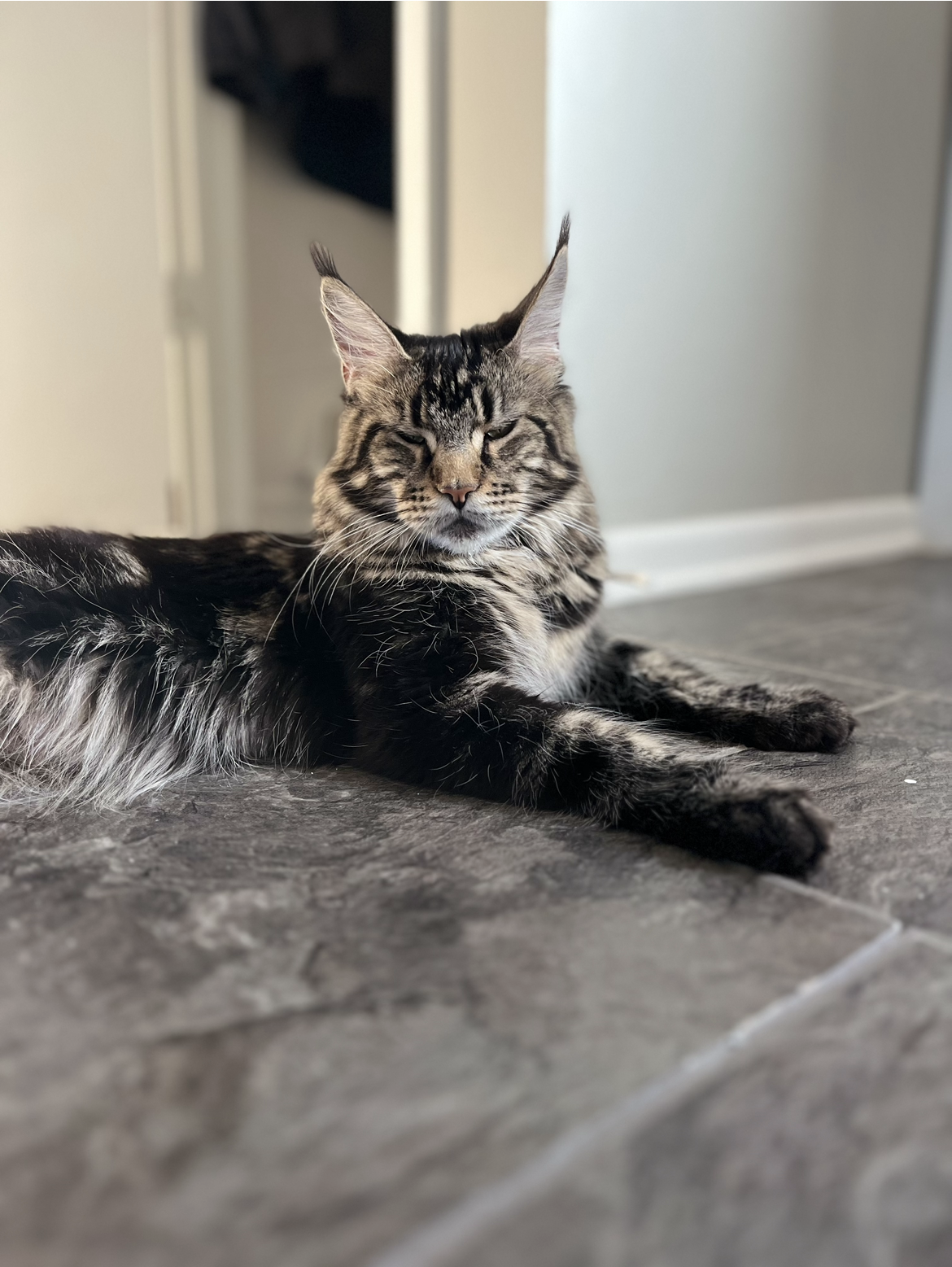 Our stunning queen Dutchess is a true gem from a prestigious shaded mainecoon lineage, boasting an exquisite coat that shimmers with soft, silvery tones. Her luxurious fur is complimented by her striking tufted ears. With a gentle and affectionate temperament, she is not only a remarkable example of the breeds beauty but also a loving devoted companion. Her lineage carries a history of champion bloodlines, ensuring her kittens will inherit her regal features and exceptional charm. She truly exemplifies the grace and majesty of the shaded mainecoon. We can’t wait to see what her kittens will look like.